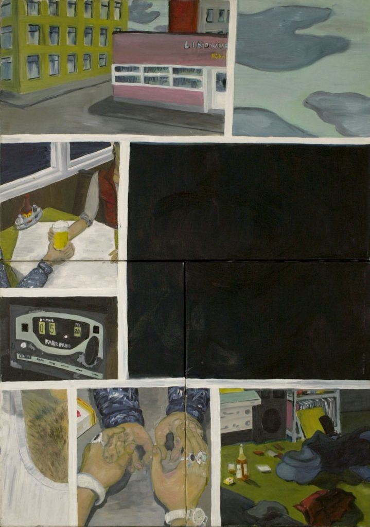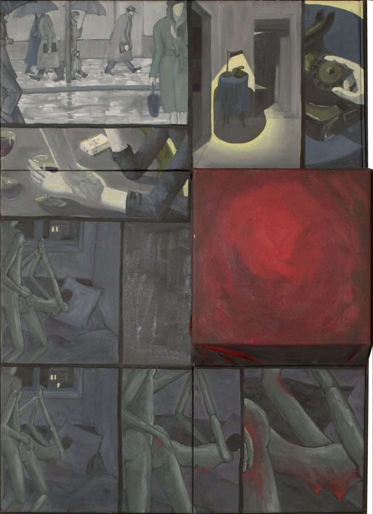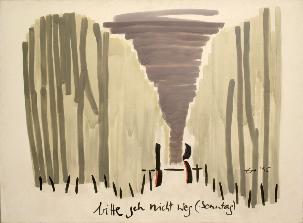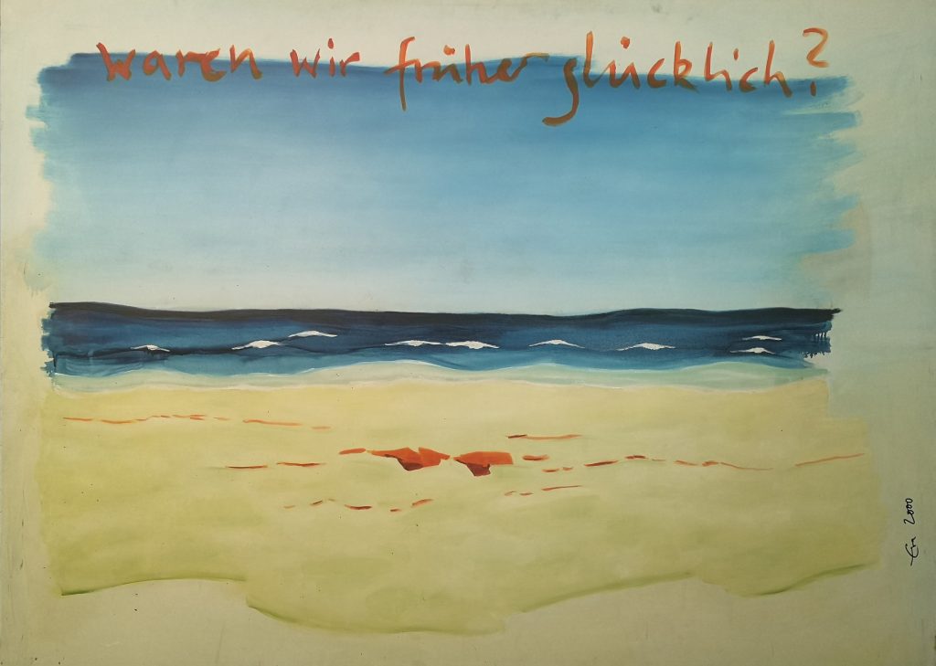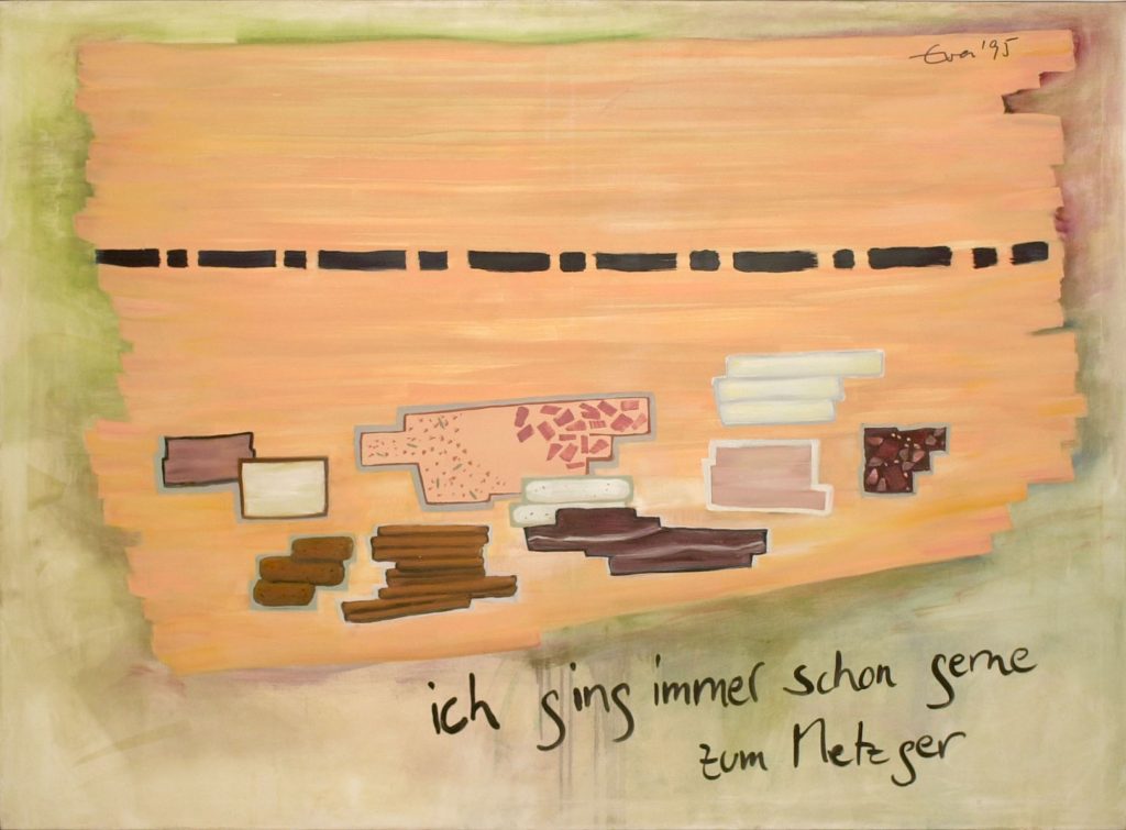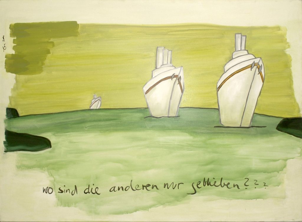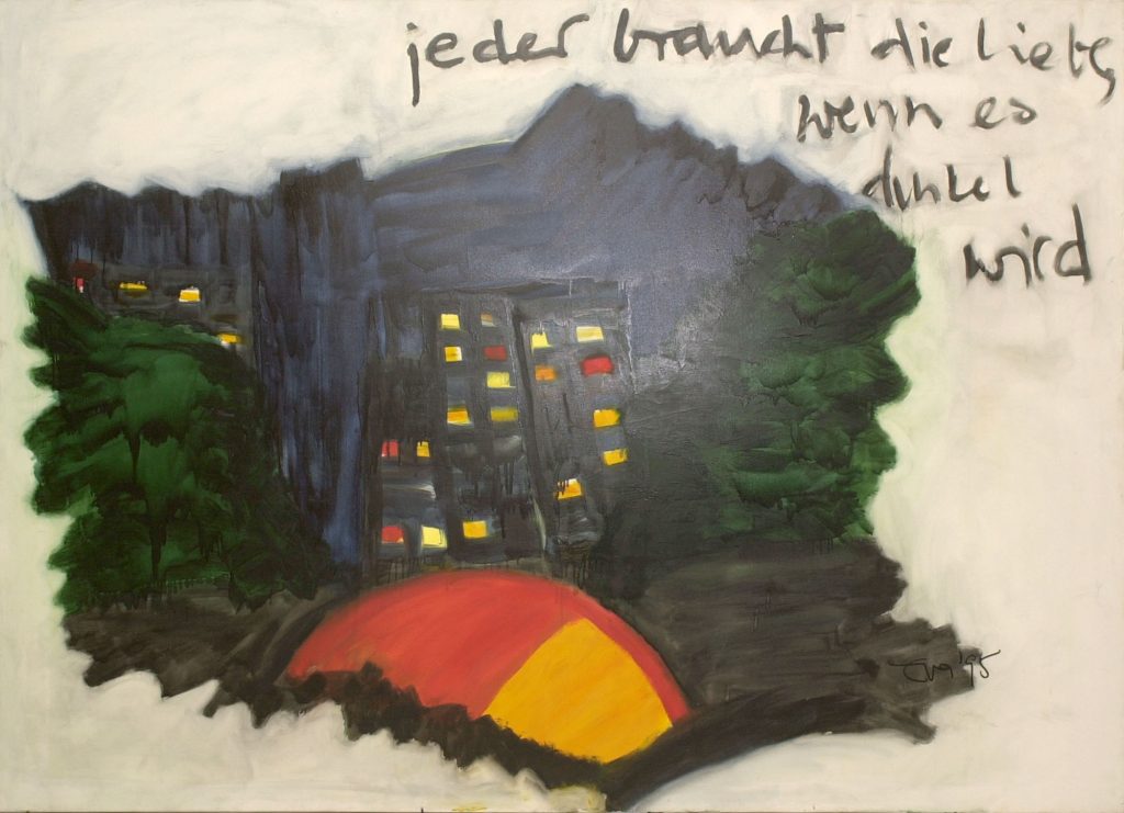 immer noch schon wieder jeder braucht die Liebe, wenn es dunkel wird, 1995, Öl auf Leinwand, 180 x 130 cm bitte geh nicht weg (Sonntag), 1995, Öl auf Leinwand, 180 x 130 cm wo sind die anderen nur geblieben?, 2000, Öl auf Leinwand, 180 x 130 cm ich ging immer schon gerne zum Metzger, 1995, Öl auf Leinwand, 180 x 130 cm waren wir früher glücklich?, 2000, Öl auf Leinwand, 180 x 130 cm ich mochte dich schon immer, 2000, Öl auf Leinwand, 180 x 130 cm wenn es Gott nicht gibt…, 1995, Öl auf Leinwand, 130 x 180 cm split screen Laster, 2000, Öl auf Leinwand, 92,5 x 180 cm wenn es Nacht wird in der Stadt I, 1991, Öl auf Leinwand, 70 x 100 cm wenn es Nacht wird in der Stadt II, 1992, Öl auf Leinwand, 70 x 95 x 10 cm